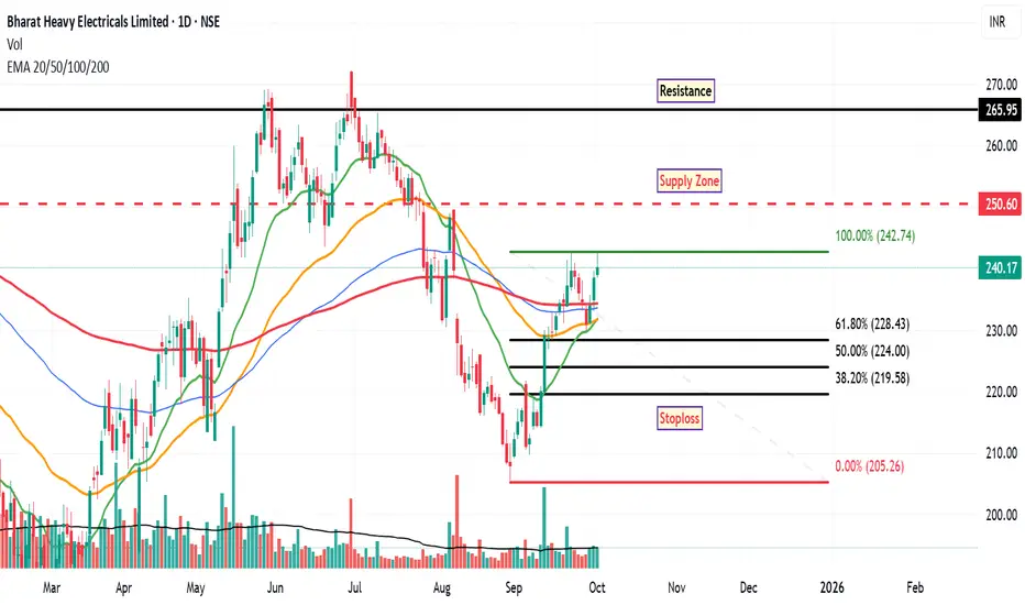 Following a recent retracement from a previously identified discount zone, the stock of Bharat Heavy Electricals Limited (BHEL) is exhibiting signs of potential bullish momentum. This outlook is supported by several technical indicators observed on the daily chart: