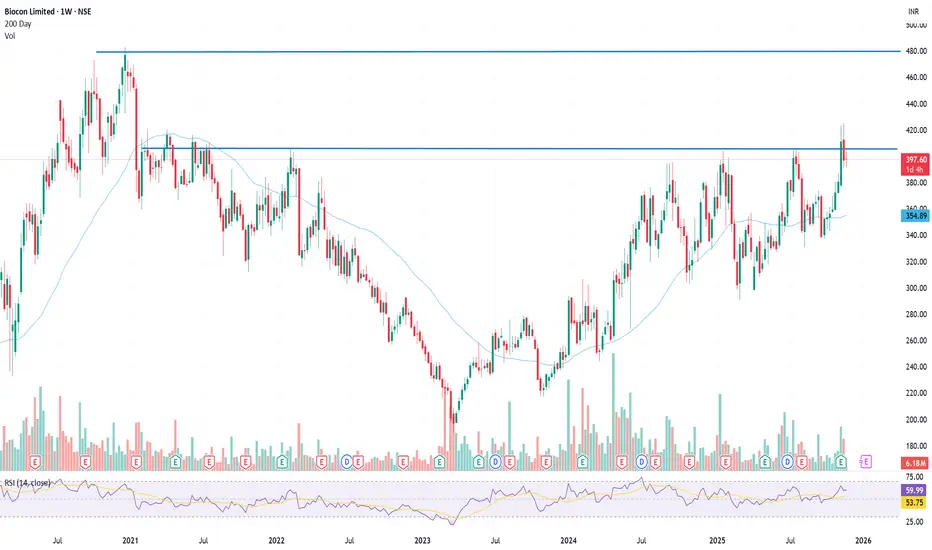 Following the sharing of CNX Pharma charts, 20 stocks are constituents to the index lead by Sun Pharma. Over the time would share my understanding for educational purpose. Biocon looks poised for a breakout on weekly charts. Pattern invalidates below 380