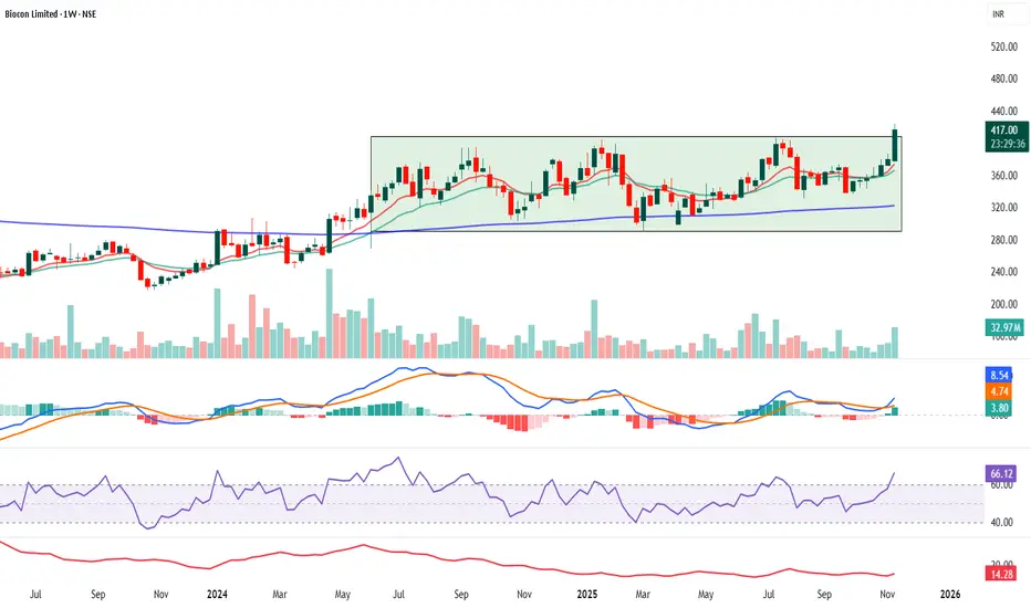 Biocon is moving inside a Darvas Box for many weeks. This means the stock is trading in a range and buyers and sellers are balanced.