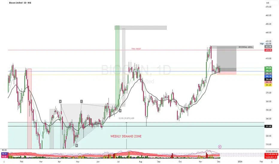 Biocon has rallied back into a previously strong supply zone around 420–425, where price earlier faced sharp rejection and a swift drop. The current move has again stalled inside this marked “Reversal Area”, with candles showing hesitation and price stretched away from the weekly demand zone near 331, making risk‑reward attractive for a corrective downswing.