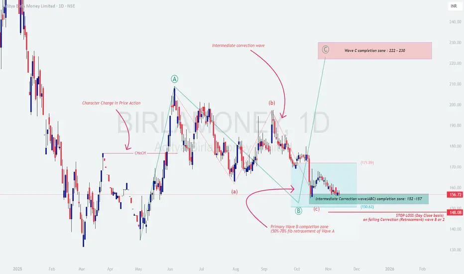 Aditya Birla Money appears to be completing its intermediate corrective Wave (ABC) within the ₹152–₹157 zone — a strong support confluence area.