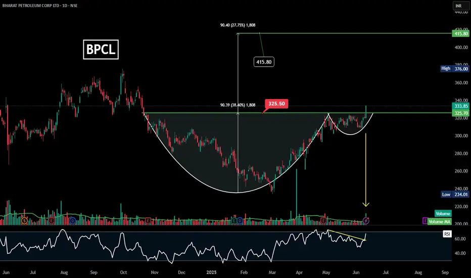 BPCL has **confirmed a cup and handle breakout** above ₹325. If it sustains above this level, a move towards ₹376–₹415+ is probable in the coming weeks.