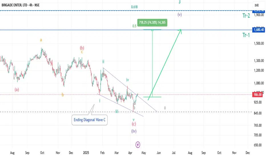 Brigade Enterprises has made a falling wedge or ending Diagonal pattern, its near breakout. As per Elliott wave the Correction looks Complete, good for short-term Buy,
