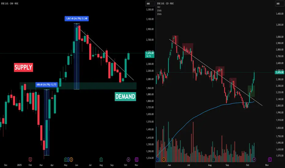 • The image above presents a multi-timeframe view of BSE Ltd (NSE), with the left side displaying the Weekly Timeframe (WTF) chart and the right side showing the Daily Timeframe (DTF) chart. The weekly chart highlights the main demand and supply zones, with large upward moves originating from demand and visible percentage swings marked for clarity.