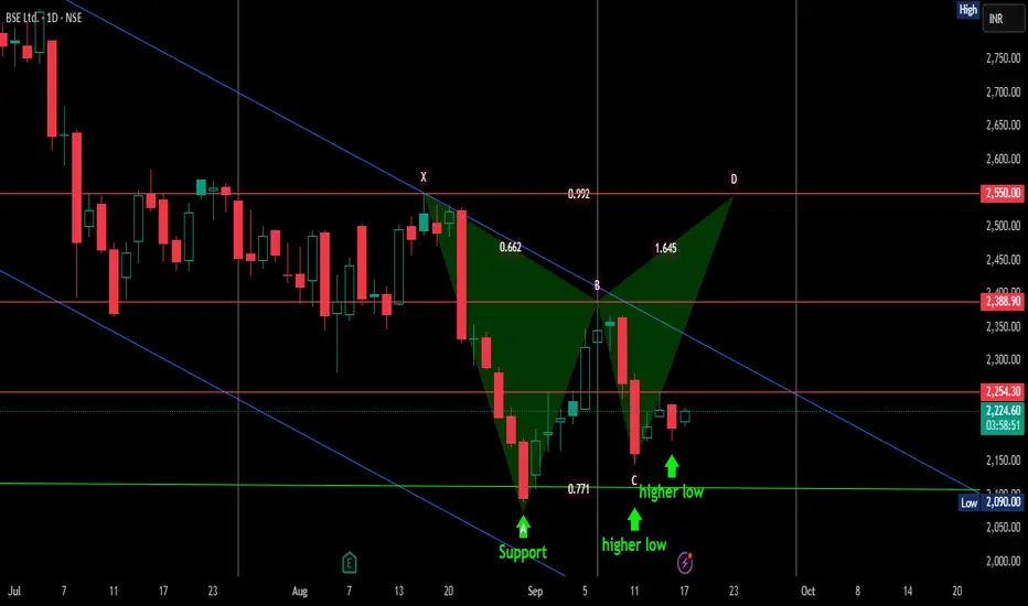so i am expecting that if it will break previous high which is marked in RED as resistance,whenever it ge break then might be break declining channel as well and will follow BAT PATTERN.
