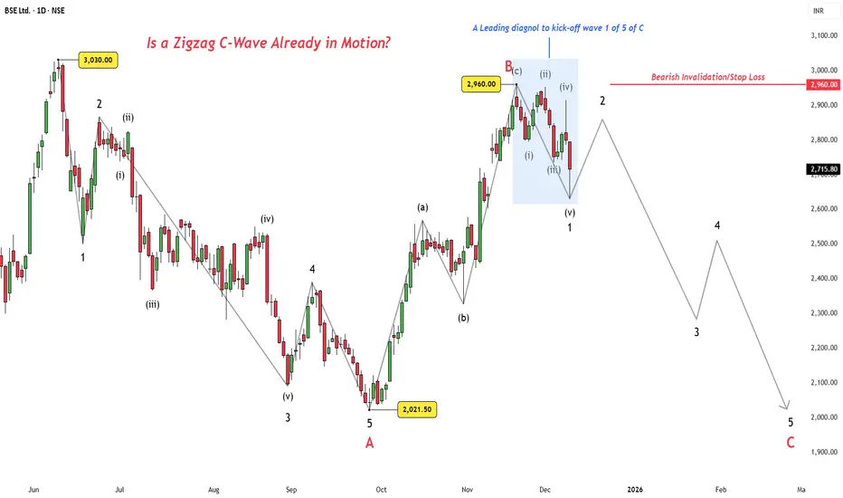 Wave A completed in five waves with extended wave 3, Wave B retraced as a controlled three, and the drop from 2960 fits the profile of a leading diagonal for Wave 1 of C.
