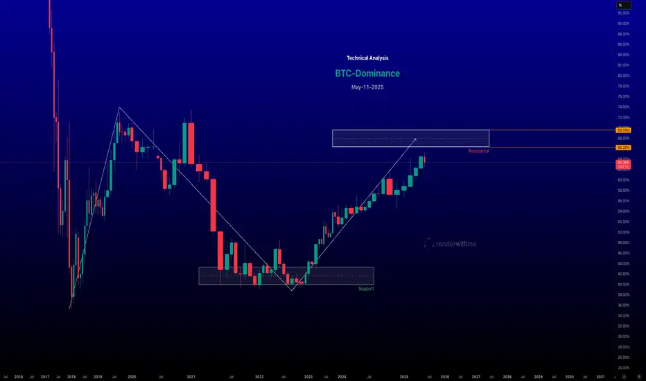 Bitcoin Dominance (BTC.D) measures Bitcoin’s market capitalisation as a percentage of the total cryptocurrency market cap. It’s a key metric for understanding market sentiment, reflecting whether investors favor Bitcoin (BTC) over alt coins or vice versa. Technical analysis of BTC.D involves studying its chart patterns, indicators, and levels to gauge potential market trends, such as Bitcoin strength or alt coin season.