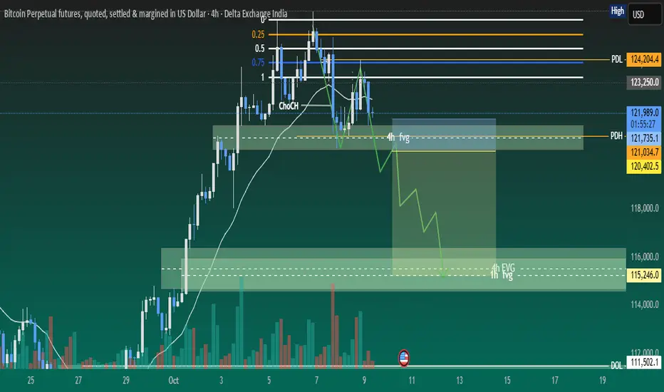 BTC has done MSS on 4h time frame and showing rejection at 4H FVG after displacement. We can see a good downside trade once below FVG is mitigated and changed to iFVG. We need to wait for price getting into right zones.