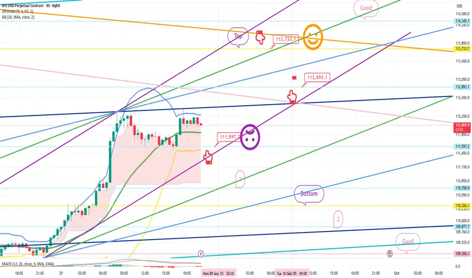 At the bottom left, the purple finger indicates the long position entry point on September 29th, at $112,893.1.