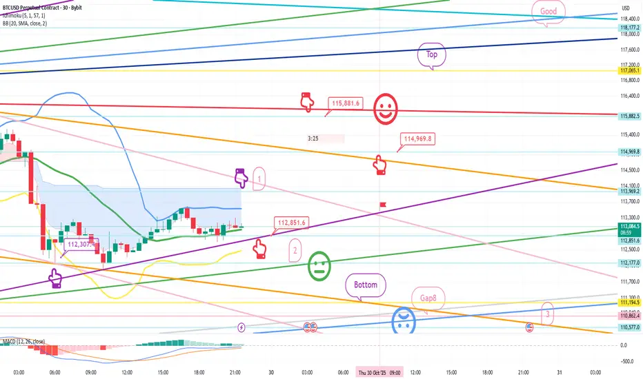 On the left, the purple finger connects yesterday's final long position entry point, the third section at $112,307.4.