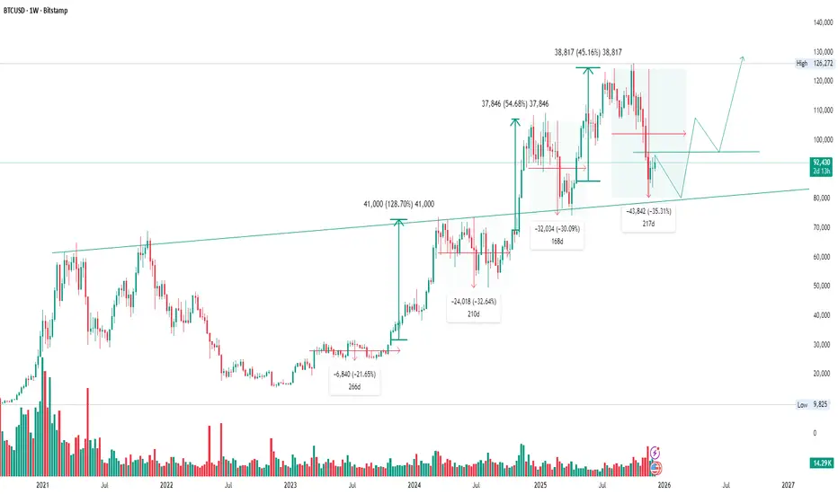 This chart highlights how Bitcoin has moved through a repeating long-term structure of strong expansions followed by deep corrective phases. Each major upward advance has been followed by a sizeable retracement, often returning toward or interacting with the long-term rising structure line. This rhythm of expansion and contraction has appeared multiple times across the chart and forms the basis of the broader market structure shown here.