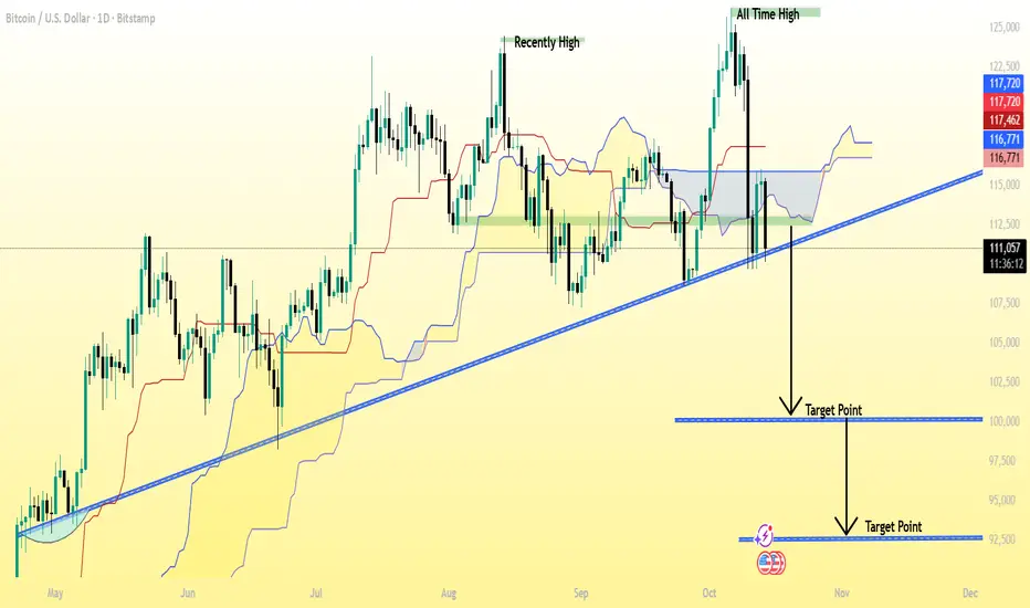 โ Market structure: After rejecting near $117,000, BTC dropped below both the Ichimoku cloud and the trendline โ confirming downside pressure.