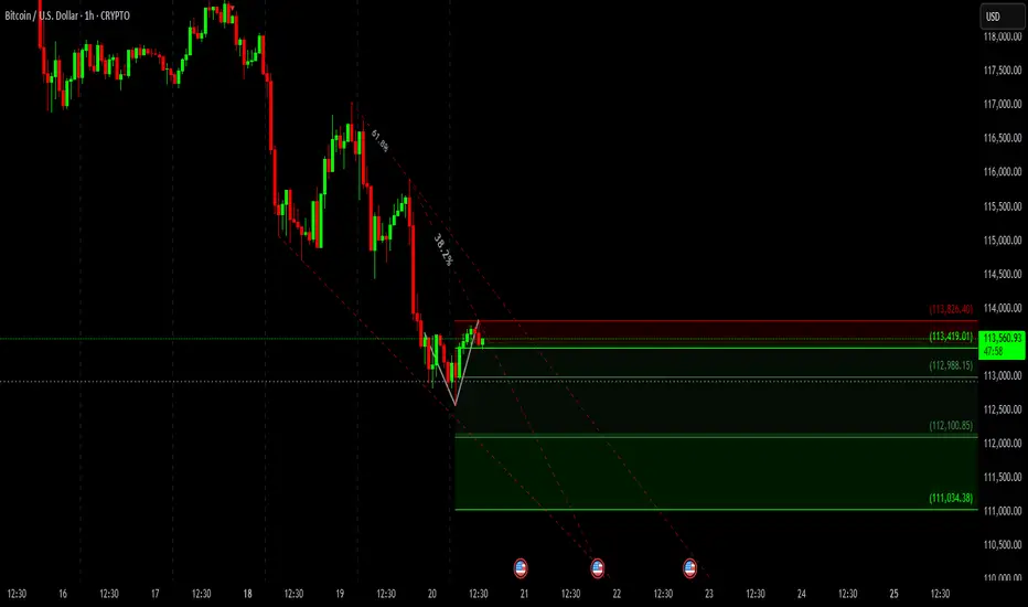 Bitcoin is currently trading around $113,440, showing signs of rejection near the 38.2% Fibonacci retracement after a recent bounce from the channel’s lower boundary.
