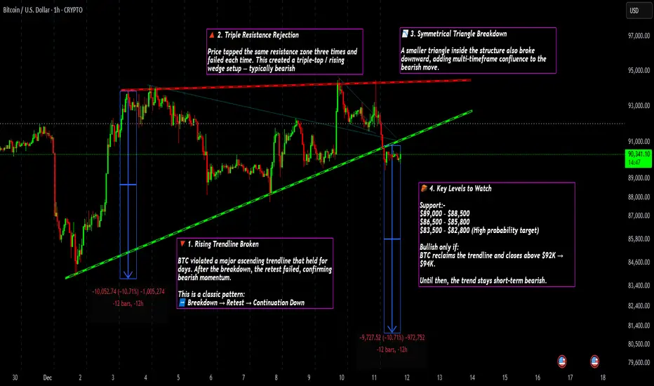 BTC violated a major ascending trendline that held for days. After the breakdown, the retest failed, confirming bearish momentum.