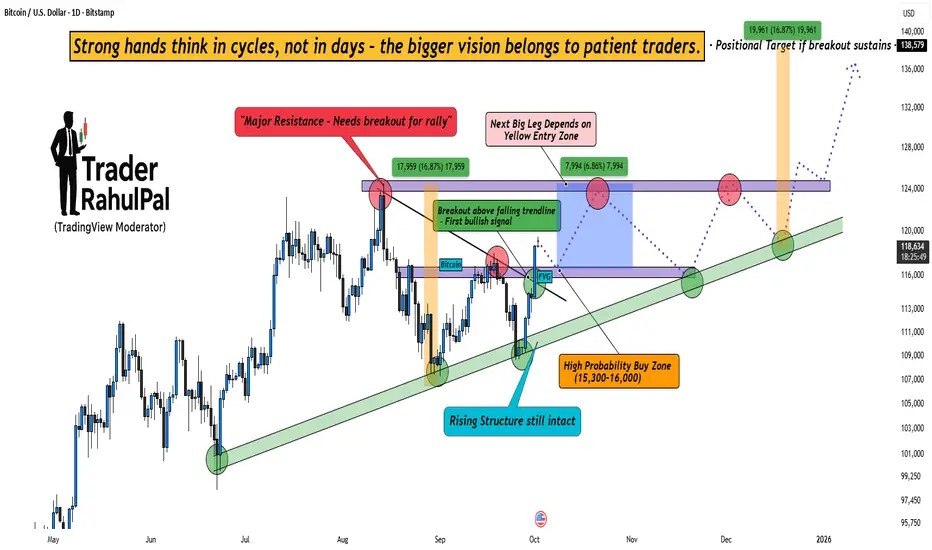 Bitcoin is currently showing clear bullish intent, but the real game lies in patience. The chart highlights a decisive breakout above the falling trendline, which is the first bullish signal after weeks of uncertainty.