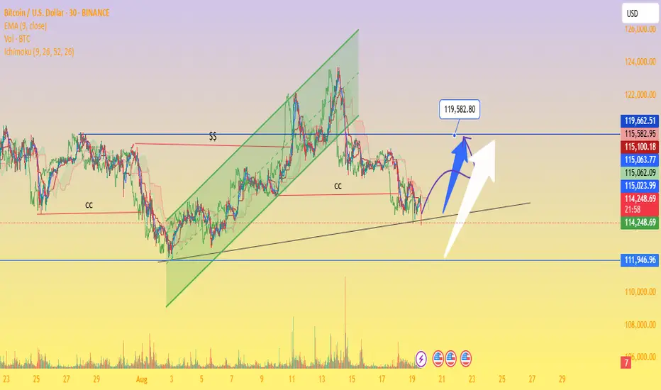 Bullish Case (Blue/White Arrows): If BTC holds above $114,000 support and breaks $115,500, a rally toward $119,500+ is possible.
