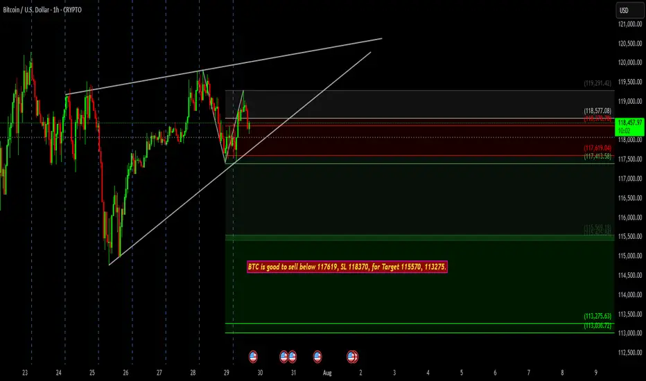 BTC is showing weakness near resistance and forming a possible rising wedge breakdown pattern on the 1H chart. A sell setup is active below 117619, with a stop loss at 118370.