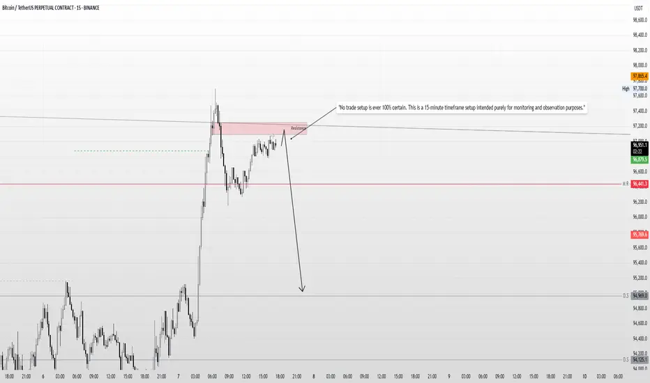 "No trade setup is ever 100% certain. This is a 15-minute timeframe setup intended purely for monitoring and observation purposes."