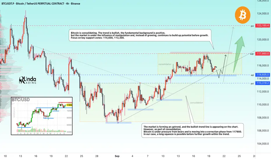 The market is forming an uptrend, with a bullish trend line appearing on the chart. However, as part of consolidation, Bitcoin is under pressure from bears and is moving into a correction phase from 117900. I expect that MM may form a long squeeze in the liquidity zone. That is, a false breakdown of the consolidation support and trend at the same time, and only then return to an upward movement.