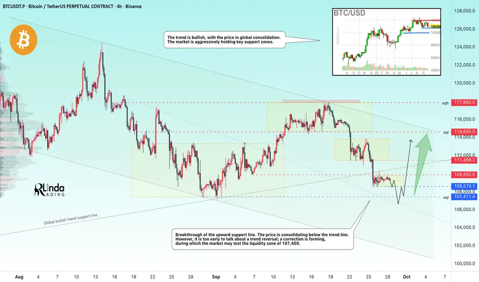 As for Bitcoin, I have identified several key areas: the boundaries of the current consolidation at 109,850 and 108,575. Accordingly, a breakout and close above or below one of these boundaries could trigger a move in the corresponding direction. But within the local trend, we can expect a decline to the intermediate bottom of 107,400, from which an attempt at growth could form. In addition, an important zone is the conglomerate of resistance at 110K and the ascending support line. If the price can form an upward momentum and close above the trend support, the market may react positively.