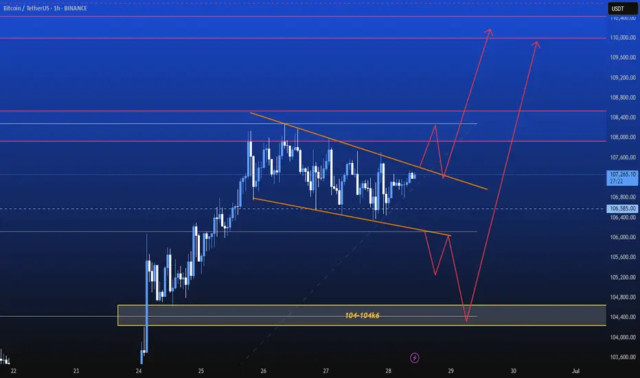 If price breaks the lower trendline, the next key target is 104,000 – 104,600
