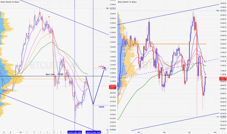 Looking at price action and TIME left on bears side on the 4hrs TF we can say that a retrace to $106k will be ok as long as it doesn't stay in that range for too long while the Daily is setting up for its move that will start Tuesday Oct 21 and taking hold by Thursday Oct 23 that's the plan for a move to the $113k - $115k , once it gets there and most important how it gets there will give us a clue if the move have legs for a test to the $130k.