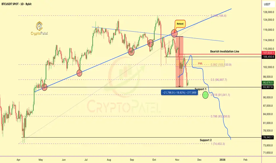 BTC has tapped the $95K zone, completing the corrective leg projected when price was rejecting the $115K–$110K range.
