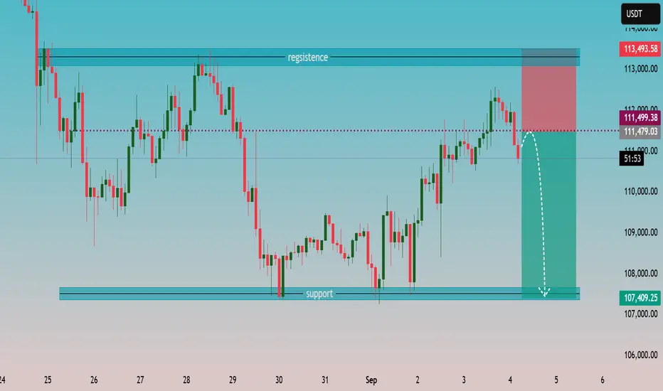Market shows rejection at resistance with sellers gaining control. The risk-reward favors a short toward strong support near 107k, unless buyers retake the 113k+ zone.