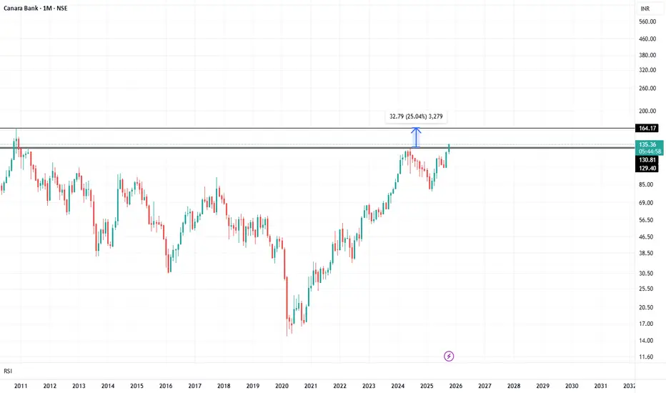 #CANBK has given a breakout at 131 on a monthly timeframe. Upside potential: 25%+ (i.e. 164 which is the stock's all-time high). Stop loss: 127. A few things to note: