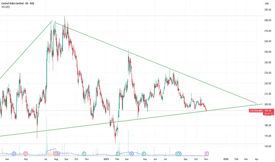 The stock is currently trading near a strong trendline support zone around ₹190–195, forming a large symmetrical triangle since early 2024.