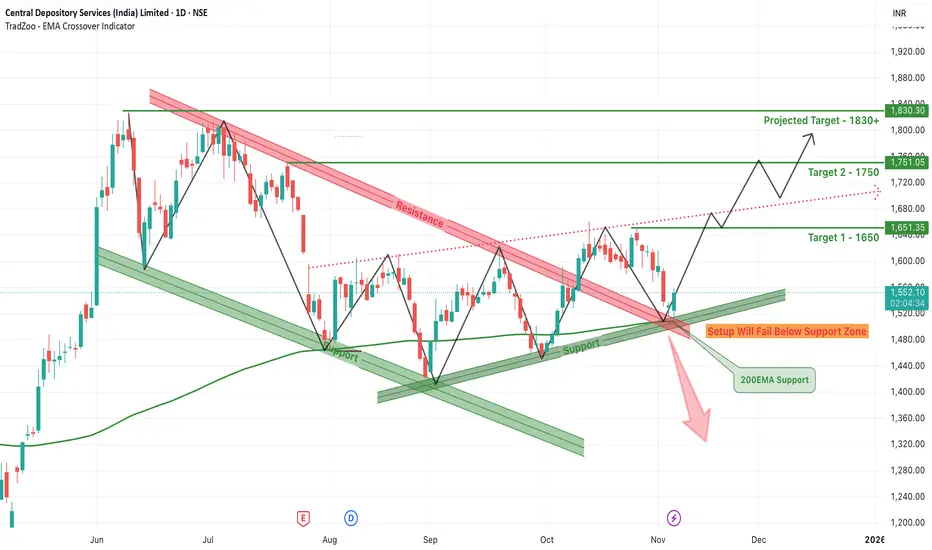 With this breakout, CDSL has now opened doors for higher targets. The immediate Target 1 is set at ₹1650, which also aligns with a recent horizontal resistance zone. Once this is breached, the next move could extend toward Target 2 at ₹1750, a level where previous price action has shown hesitation. If momentum continues to build and the broader market supports the move, the final projected target of ₹1830+ becomes achievable in the short to medium term.