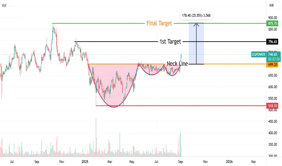CG Power given breakout of Complex Cup & Handle Pattern from neckline arround 700 level. Final target of it will 875 level & Near term target will be 796 level with a stoploss of 680 Rs.