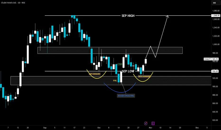 At the head, there’s a bullish engulfing candle, which signals strong buying interest and potential reversal. The neckline (resistance turned support) sits roughly around ₹936–940, and the price has broken above it, confirming the bullish structure.
