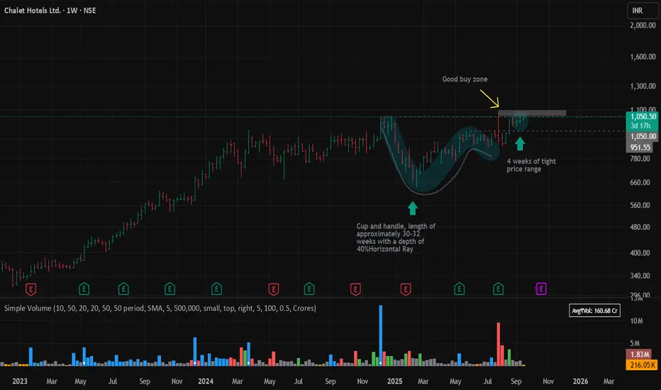 Emerging from a cup with handle pattern, Chalet hotels has formed a 4 week tight price range and is also trading near its pivot.