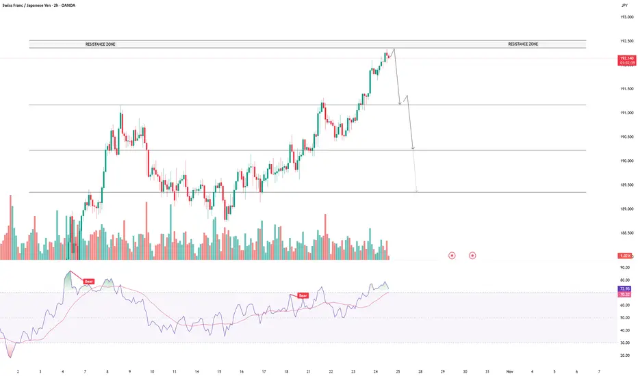 The overall structure remains bullish but the pair is currently trading near local highs, which coincides with a potential reversal zone. After such an extended rally, there are high chances of a pullback or corrective phase before the next directional move. A short-term correction toward support could allow buyers to re-enter at more favorable levels. If the pair fails to gain momentum above the resistance zone 192.50 – 192.75, a retracement toward 191.20 – 190.50 could unfold.
