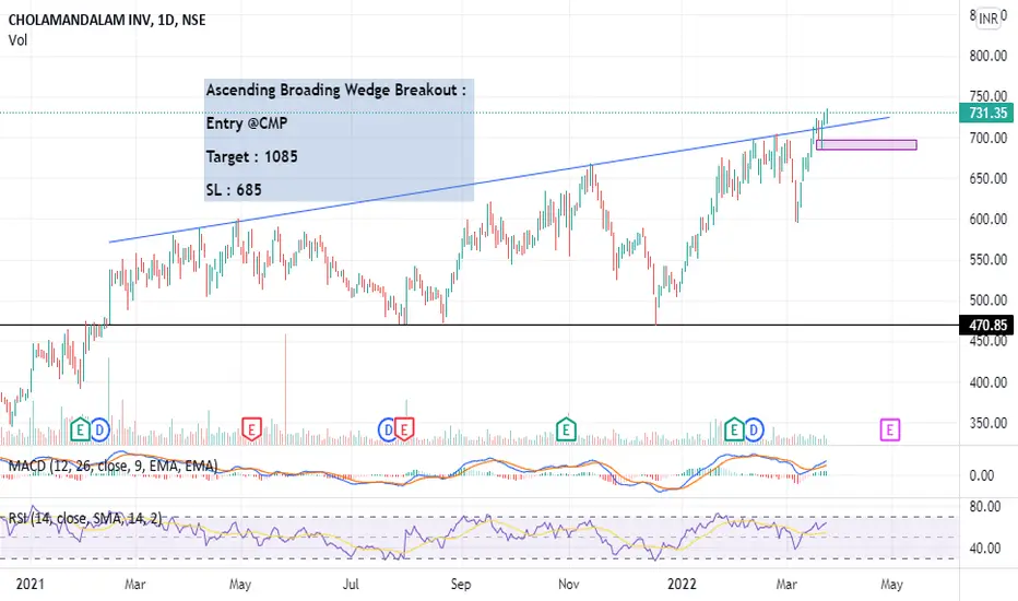 CHOLAMANDALAM INVESTMENT can be entred at CMP for Target of Rs. 1085 with Stop loss of Rs. 685