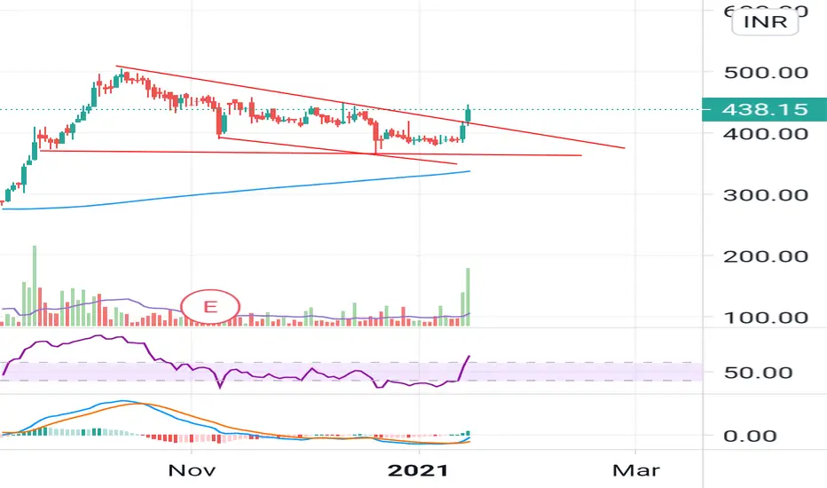 Price has formed channel and triangle and broken above 200 MA, with volumes showing bullish sign.first target i see 500 , there is quality buying whenever bulls appear in traingle.with sl -10% postionally.