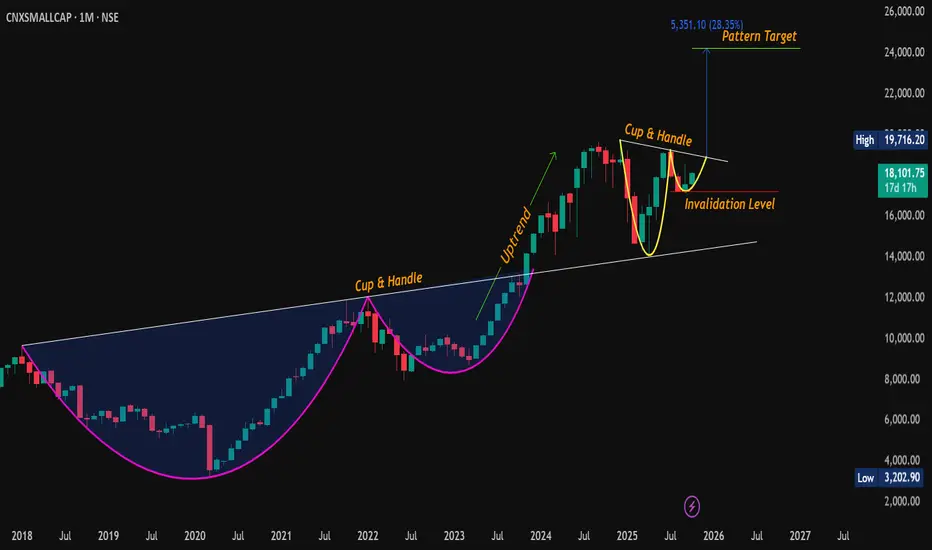 Classic Cup & Handle pattern is forming on the monthly chart of Nifty Small Cap Index, signaling potential for a strong bullish continuation if key resistance levels are cleared.