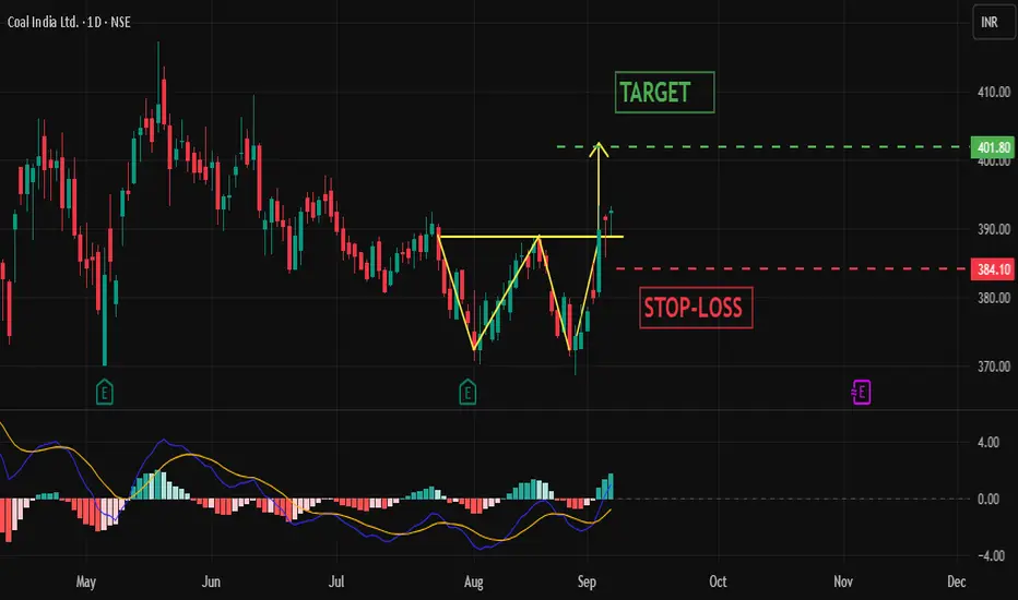 COALINDIA has formed a double bottom pattern, which looks like a “W” on the chart. This occurs when price tests the same support level twice and holds strongly. It signals that buyers are defending that zone. Once the neckline (resistance above the bottoms) is crossed with momentum, it often leads to a strong upward move.