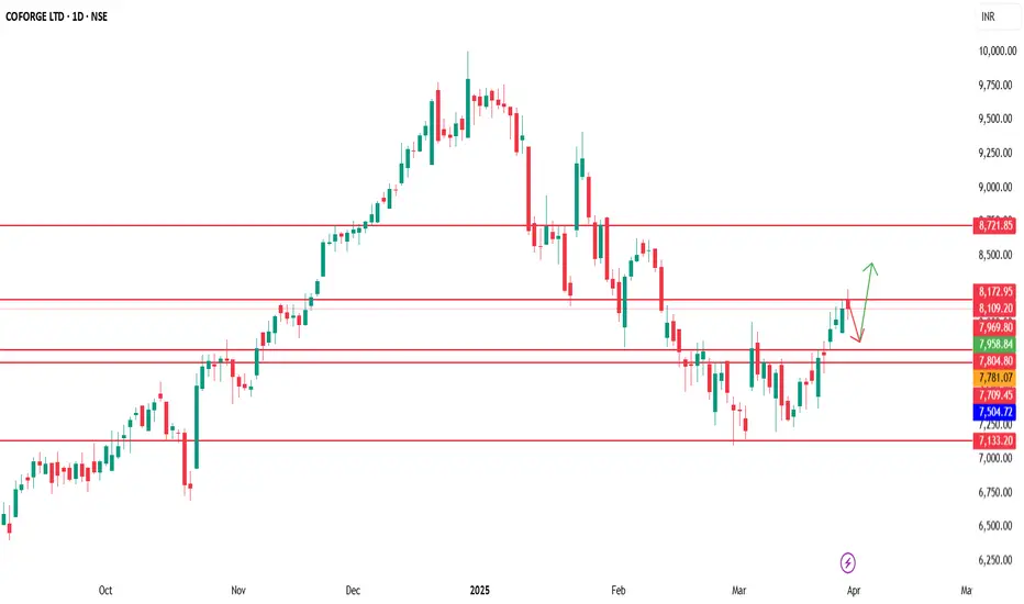 A decisive move above ₹8,200 could fuel further bullish momentum, pushing Coforge toward ₹8,500-₹8,600. On the downside, a break below ₹7,700 may lead to extended selling pressure. Keep an eye on IT sector performance, global market trends, and institutional activity for further confirmation.