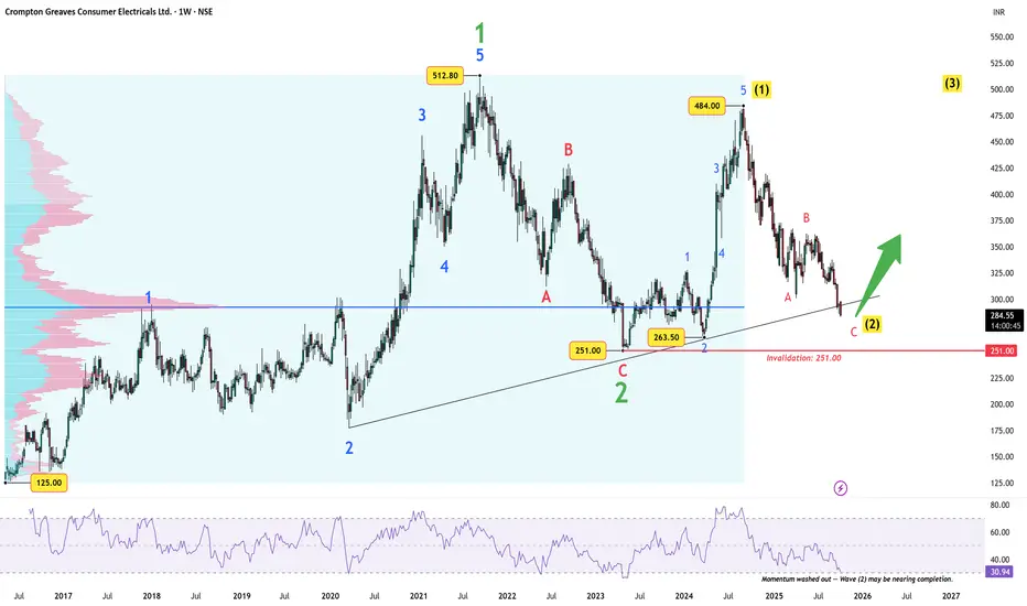 After a sharp corrective leg, Crompton Greaves Consumer appears to be completing a Wave (2) retracement, setting the stage for a potential next impulse.