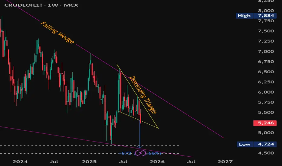 #CrudeOil #MCXCrude #ChartPatterns #FallingWedge #DescendingTriangle #PriceAction #BreakdownAlert #SwingTrading #CommodityTrading