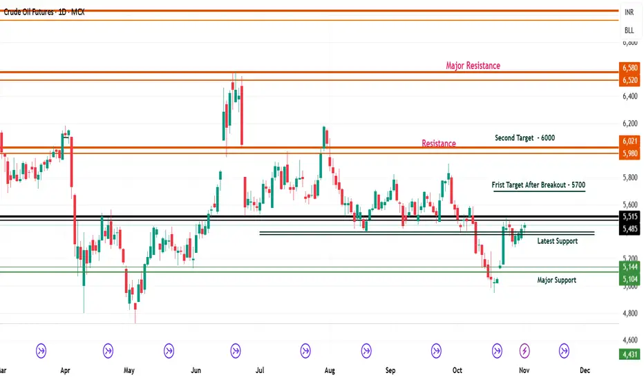 Once crude oil breaks above ₹5,515 with good volume, the first upside target will be around ₹5,700.