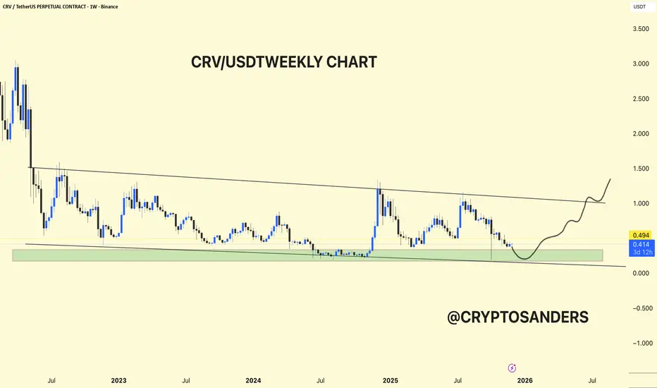 The weekly chart, CRV/USDT, is still in a long-term downtrend, but within a large accumulation support zone, where strong surges have previously occurred.