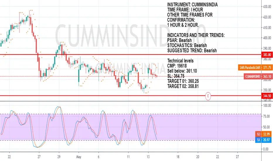 My analysis of CUMMINSIND is expected to continue its downtrend for some time now. On day time frame Stochastic & PSAR have confirmed the bearish trend. The Bearish trend is confirmed in 1 HOUR & 2 HOUR time frames. If it closes below 358.81 on the end of day time frames we may also see 349.50 to 346.30 levels also