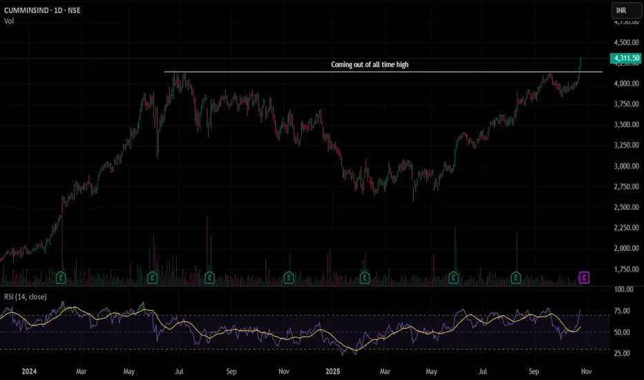 Cummins India is coming out of all time high of 4150 stock touched in July 2024. If the stock stays above 4150 for this week can result in further upside in the stock.