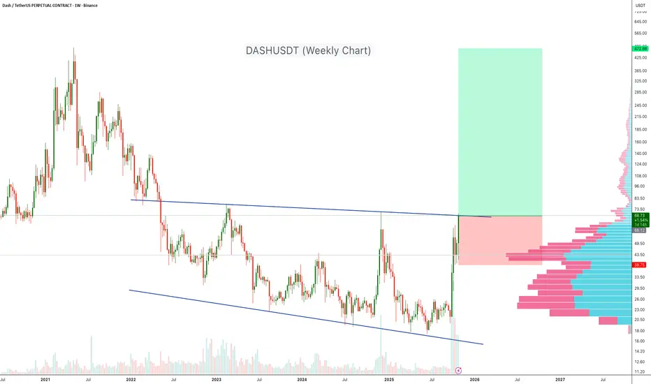 DASH has been trading inside a multi-year descending channel since early 2021. After several rejections from the upper boundary, the price has finally shown a strong breakout with a massive weekly candle, signaling potential trend reversal.