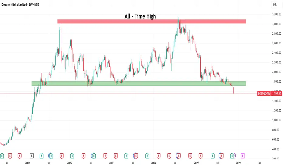 Deepak Nitrite Limited has experienced a super bullish rally over the past decade, transforming from below ₹100 to reaching ₹3,000 by October 2021 - representing an impressive 30x growth in just 10 years. However, the stock has since entered a prolonged consolidation and correction phase.