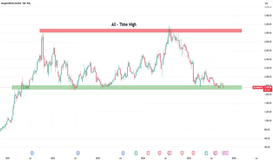 Deepak Nitrite has experienced an extraordinary rally over the past decade—from below ₹100 to a peak near ₹3,000 in October 2021. The ₹3,000–₹3,200 zone has repeatedly acted as resistance, while the ₹1,700–₹1,800 range has served as a strong support zone. Currently, the stock trades around ₹1,760, hovering near that support.