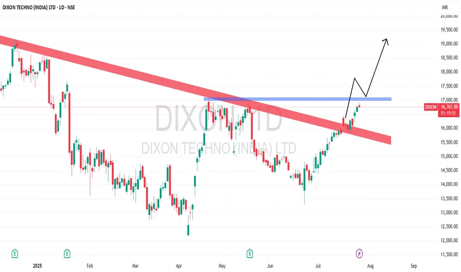 Dixon is showing a compelling technical breakout, backed by outstanding FY24 and Q4 results. Uptick above ₹17,000 with solid support suggests continuation toward ₹18,500. Strong fundamentals reinforce medium‑term potential, but critical stops at ₹14,000 and ₹12,000 should be respected.